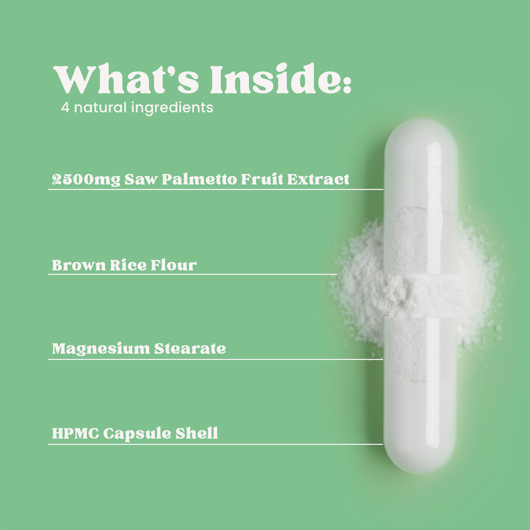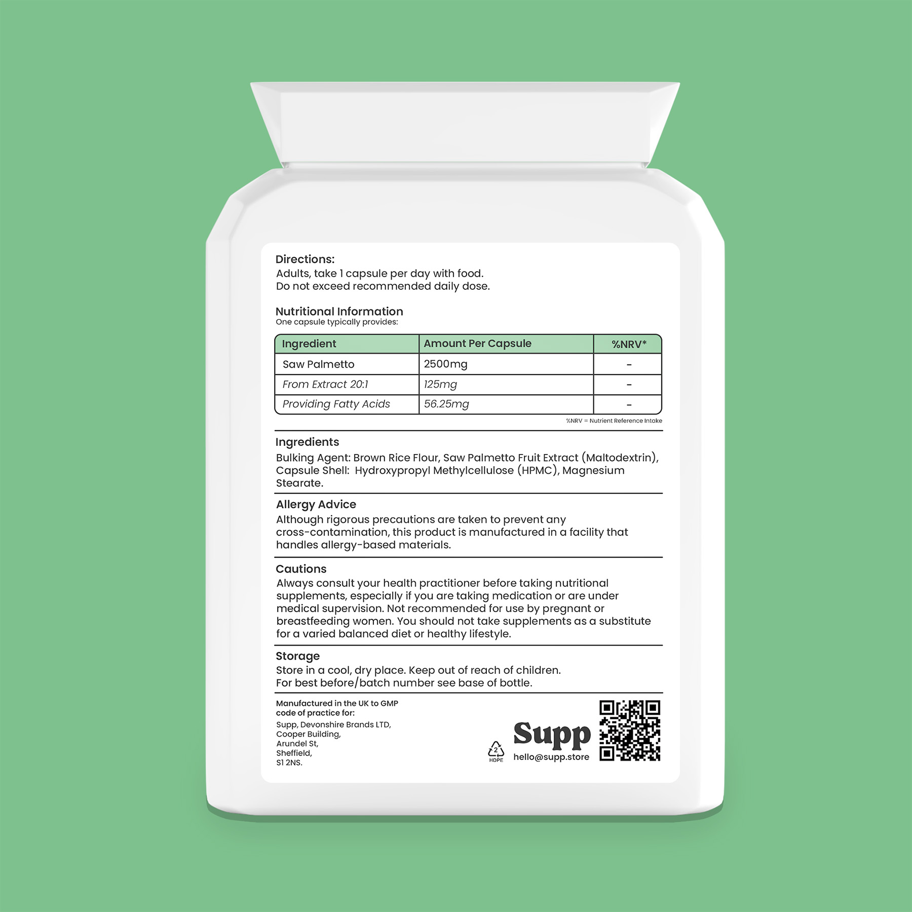 Bulking Agent – Brown Rice Flour, Saw Palmetto Fruit Extract (Maltodextrin), Capsule Shell – Hydroxypropyl Methylcellulose (HPMC), Magnesium Stearate